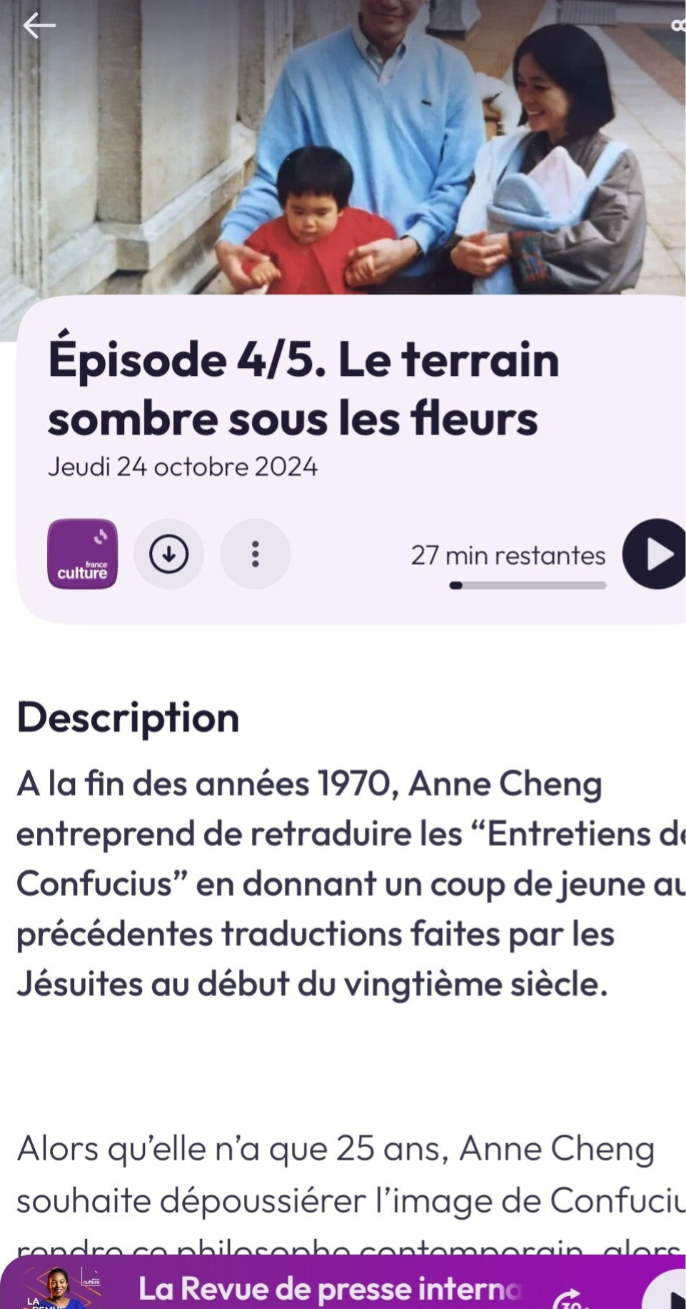 Exemple de présentation : Anne Cheng philosophe et professeure au Collège de France sur France culture...